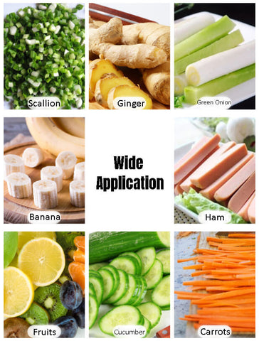 [Wide Application] Perfect for almost all vegetables or fruits that need to be shredded or sliced, like scallions, zucchini, potatoes, onions, tomatoes, carrots, cucumbers, bananas, strawberries, boiled eggs, and more vegetable and foods, facilitate your food making process and create delicate snacks for your family or friends.