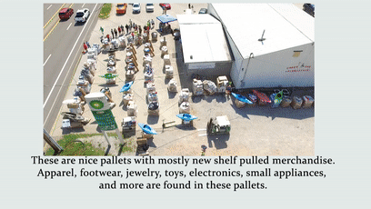 I have bought 6 pallets here and will be back to get more. Can't wait to keep getting more awesome pallets that are untouched unless people are going threw them to see what is in them. I can understand that but we are all curious and it's ok to see what you are getting. Be back soon to see you guys again.